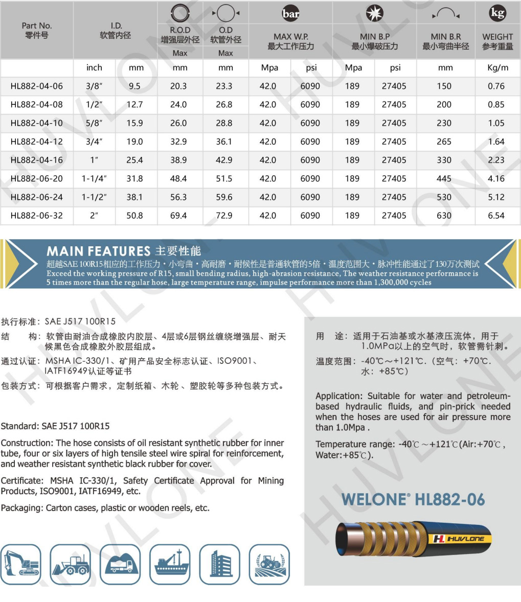 符合/超越SAEJ517100R15四層鋼絲纏繞橡膠軟管