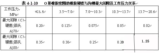 在橡膠材料標(biāo)準(zhǔn)中,以硬度和壓縮永久變形兩項(xiàng)性能最為主重。選擇壓縮變形較小的橡膠材料對(duì)密封性能是有利的,而硬度對(duì)于O形橡膠密封圈耐壓和抗擠又是至關(guān)重要的。根據(jù)國(guó)內(nèi)標(biāo)準(zhǔn)和實(shí)踐經(jīng)驗(yàn),橡膠在規(guī)定溫度下的壓縮永久變形最大不超過(guò)50%。而橡膠的硬度與密封工作壓力密切相關(guān),壓力越高,硬度也是越高;參見(jiàn)表4-1-11