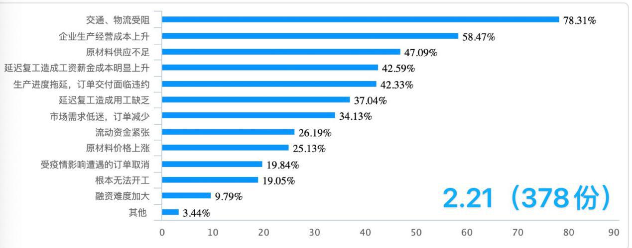 “這一突出棘手的問題,也由 2 月 12 日占比 78.4%的企業(yè)反饋,到十日后 2 月 21 日占比降為 78.31%,到問卷截止時,這一占比為78.2%。從這組數(shù)據(jù)上可以看出:隨著有序復(fù)工的推進(jìn),國家和地方在交通運(yùn)輸、物流上出臺了相應(yīng)的政策支撐,使交通、物流受阻得以