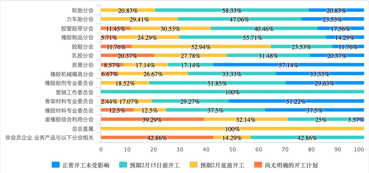 各分會及專業(yè)委員會由于產(chǎn)品性質(zhì)不同,復(fù)工情況也有差異。從上圖 5 中可以看出,炭黑企業(yè)、骨架材料企業(yè)的填報(bào)企業(yè)中,超過半數(shù)以上的屬于正常開工未受影響;橡膠材料專委會會員有天然橡膠、合成橡膠生產(chǎn)加工企業(yè),還有大部分企業(yè)是貿(mào)易型企業(yè),其正常開工企業(yè)占比也在 37.5%;另外橡膠機(jī)械模具分會會員填報(bào)中也有三成企業(yè)正常開工。受影響較大的至今復(fù)工情況仍不樂觀的有廢橡膠綜合利用企業(yè),有 39.29%的填報(bào)企業(yè)開工日期尚待定;還有乳膠制品企業(yè)、膠鞋企業(yè)也受影響較大。