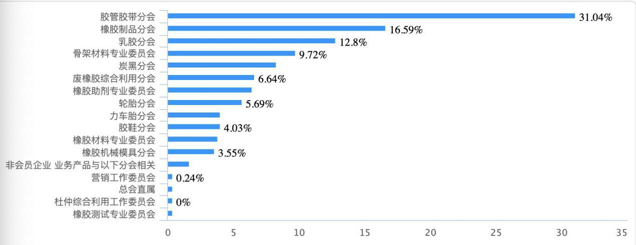422 份問卷填報(bào)企業(yè)中,131 家來自膠管膠帶分會,占比為 31.04%;70 家來自橡膠制品分會,占比為 16.59%;54 家來自乳膠 分會,占比為 12.8%;骨架專委會分會有 41 家,占比 9.72%;炭黑 分會和廢橡膠綜合利用分會分別為 35 家和 28 家,占比分別為 8.29% 和 6.64%;橡膠助劑專委會有 27 家企業(yè)填報(bào),占比為 6.4%;輪胎 分會有 24 家填報(bào),占比 5.69%;力車胎分會、膠鞋分會均有 17 家 企業(yè)填報(bào),占比 4.03%;橡膠材料專委會有 16 家企業(yè),占比 3.79%; 橡膠機(jī)械模具分會 15 家企業(yè)填報(bào),占比 3.55%。見下圖 1。