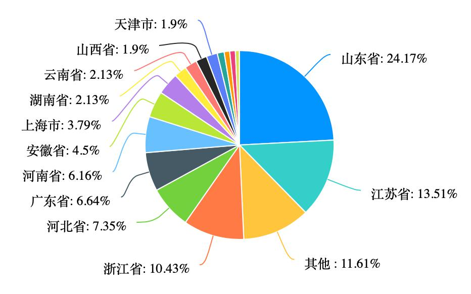 從答卷情況來看,山東省所占的份額較大,其次是江蘇省、浙江省,河北省和廣東省,選擇其他選項(xiàng)的 44 份答卷中,13 家來自遼寧省、10 家來自四川省、8 家來自江西省、,其余來自貴州、甘肅、廣西等省市自治區(qū)以及一家境外企業(yè)。