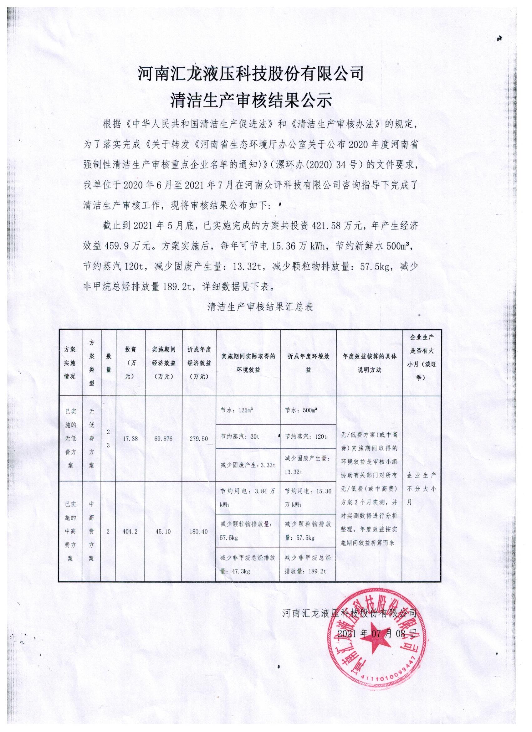 河南匯龍液壓科技股份有限公司清潔生產(chǎn)審核結(jié)果公示